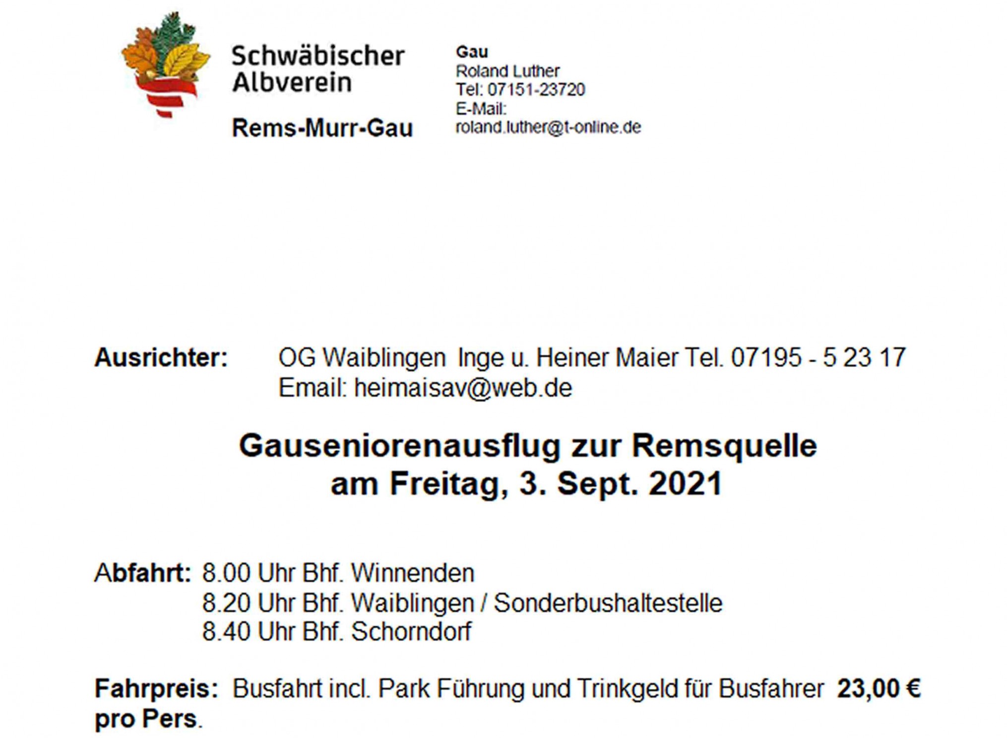 Abfahrt: 8.00 Uhr Bhf. Winnenden