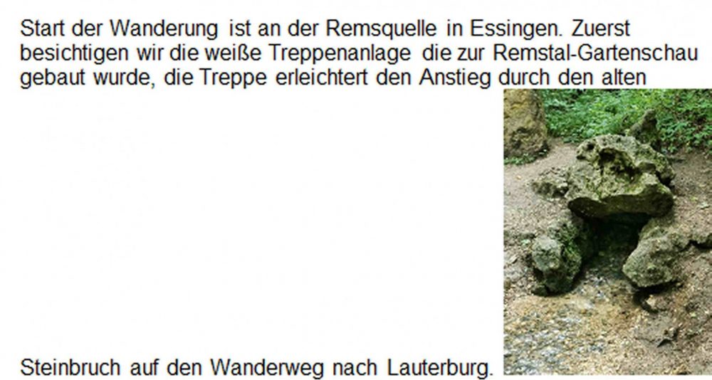 Start der Wanderung ist an der Remsquelle in Essingen. Zuerst besichtigen wir die weiße Treppenanlage die zur Remstal-Gartenschau gebaut wurde, die Treppe erleichtert den Anstieg durch den alten Steinbruch auf den Wanderweg nach Lauterburg.