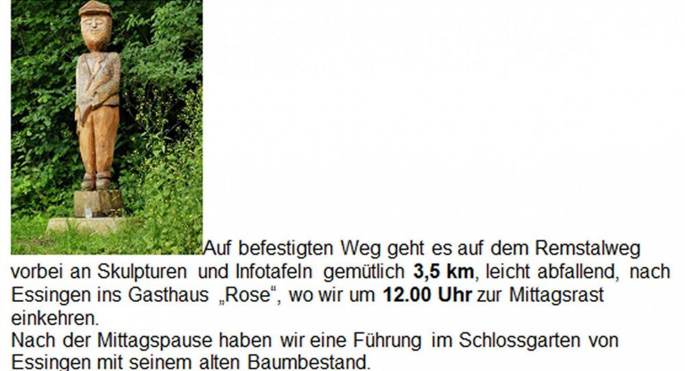 Auf befestigten Weg geht es auf dem Remstalweg vorbei an Skulpturen und Infotafeln gemütlich 3,5 km, leicht abfallend, nach Essingen ins Gasthaus „Rose“, wo wir um 12.00 Uhr zur Mittagsrast einkehren.