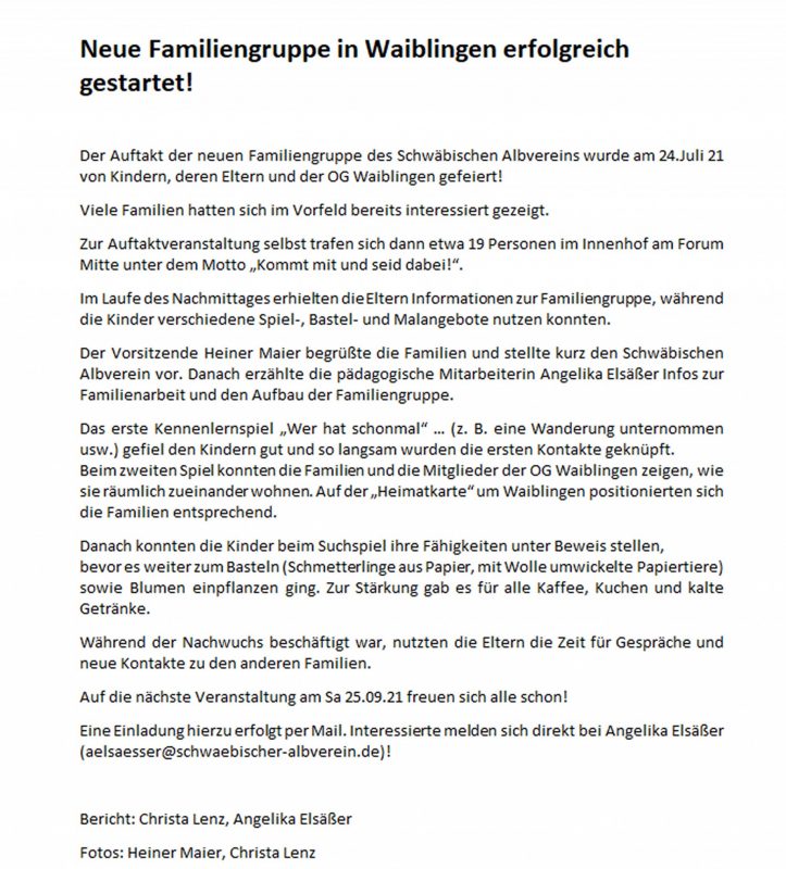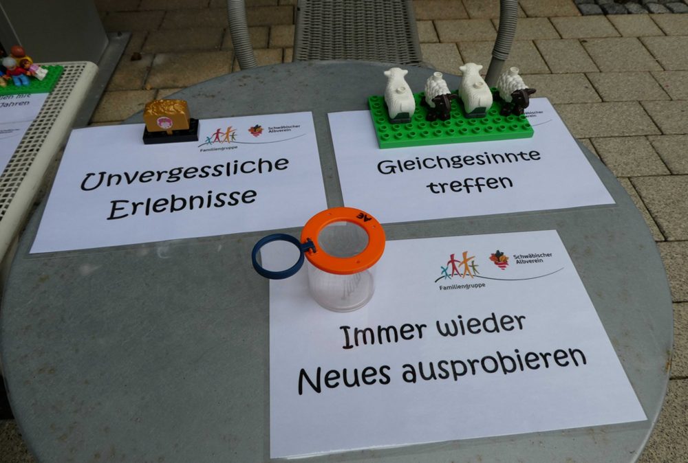 Unterstützung erhalten sie dabei von der pädagogischen Fachkraft Angelika Elsäßer, einer hauptamtlichen Mitarbeiterin des Schwäbischen Albvereins. Sie unterstützt die Ortsgruppen bei der Planung und Durchführung der Veranstaltungen vor Ort. Langfristiges Ziel ist es, eigenständige Familiengruppen aufzubauen, die gemeinsam und selbstverantwortlich ihre Aktivitäten gestalten.